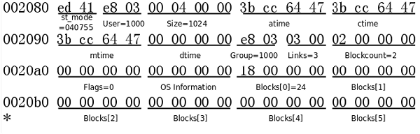 lost+found目录的inode和数据块的格式。mount这个文件系统,在里面添加删除文件,然后umount下来,再次分析它的格式,和原来的结果比较一下看哪些字节发生了变化。